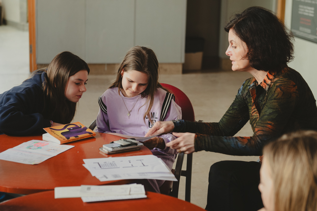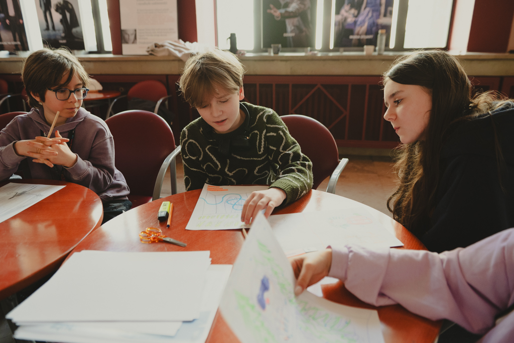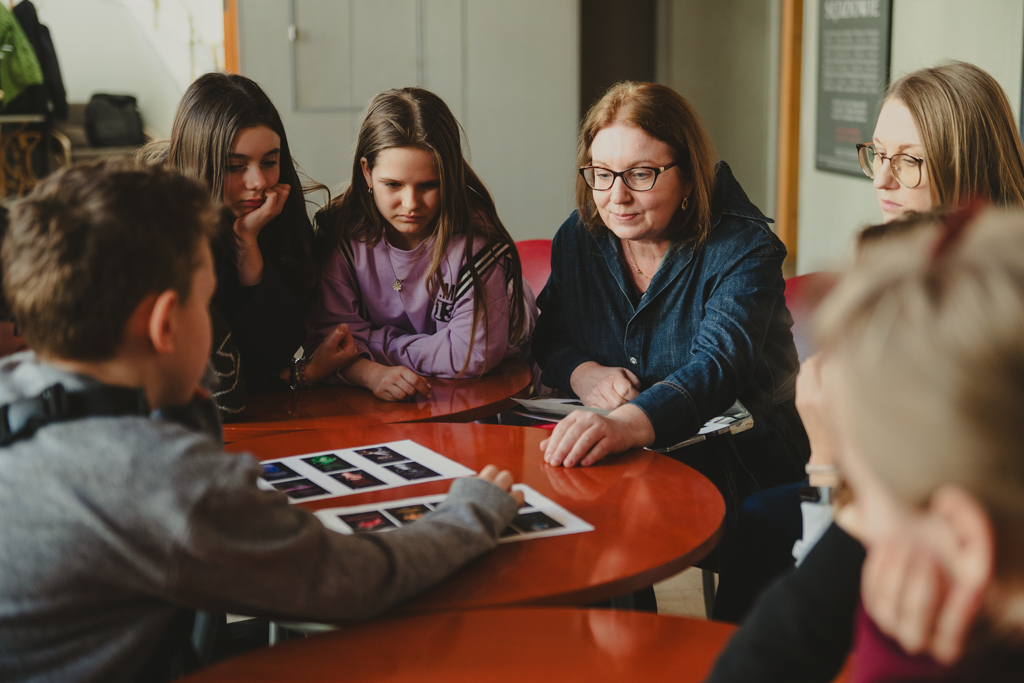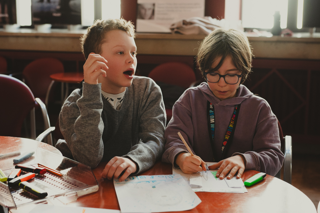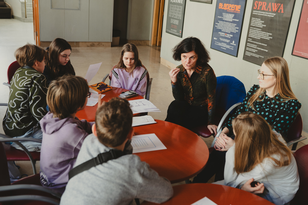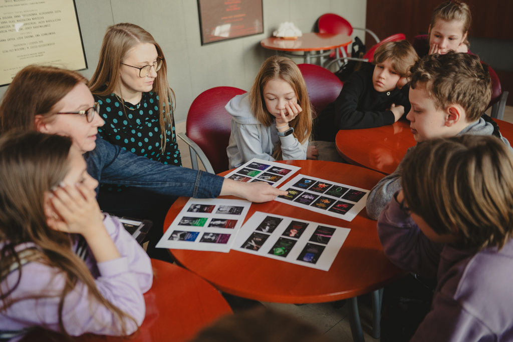 Warsztaty „Promujemy, zapowiadamy, opisujemy, sprzedajemy” dla uczennic i uczniów Szkoły Podstawowej nr 211 im. Janusza Korczaka, prowadzenie – Anna Pękala (Dział Promocji i Organizacji Widowni). Fot. Marta Ankiersztejn