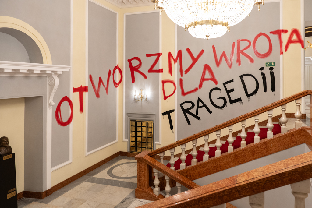 Pozostałe przestrzenie Teatru zachęcają niejako do gry w podchody. W zakamarkach budynku, na jego piętrach, schodach i ścianach wybrzmiewają słowa i symbole pochodzące zarówno z protestów, jak i z samego dramatu Tadeusza Micińskiego. Nie brak tu również rysunkowych prac Kiełbowicza, który daje się w ten sposób poznać jako kronikarz polskiej codzienności. Każdego dnia tworzy wizualny komentarz-kalambur.