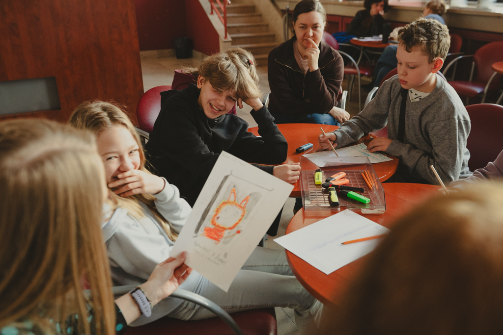 Warsztaty „Promujemy, zapowiadamy, opisujemy, sprzedajemy” dla uczennic i uczniów Szkoły Podstawowej nr 211 im. Janusza Korczaka, prowadzenie – Anna Pękala (Dział Promocji i Organizacji Widowni). Fot. Marta Ankiersztejn